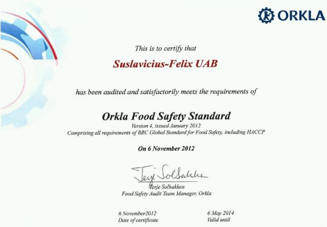 Šių metų lapkričio mėn. UAB Suslavičius-Felix vykdytas kasmetinis maisto saugos ir kokybės auditas, organizuotas Orkla Group. Audito išvadose pažymima, kad įmonės veikla visiškai atitinka Saugios maisto gamybos praktikos reikalavimus (BRC Global Standard for Food Safety). Suteiktas sertifikatas galioja iki 2014 m.